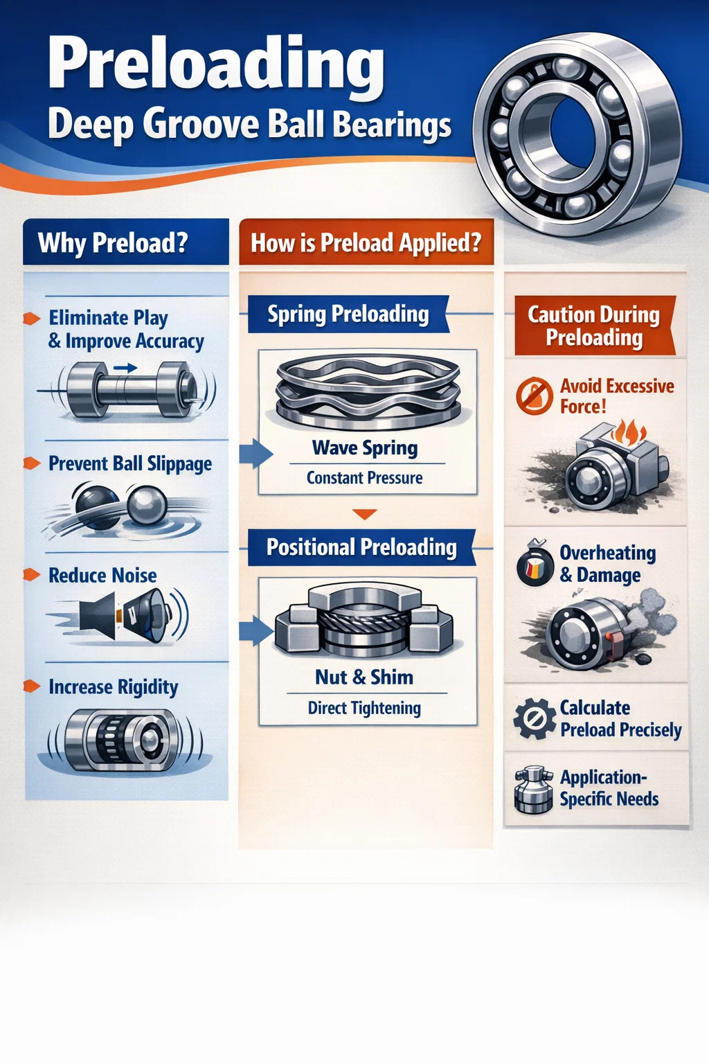 Forhindre at stålkulene "sklir": Ved ekstremt høye hastigheter eller under lav belastning kan det hende at stålkulene ikke "ruller", men snarere "glider" på løpebanen. Forbelastning påfører press, tvinger dem til å rulle ordentlig og forhindrer slitasje på løpebanen.