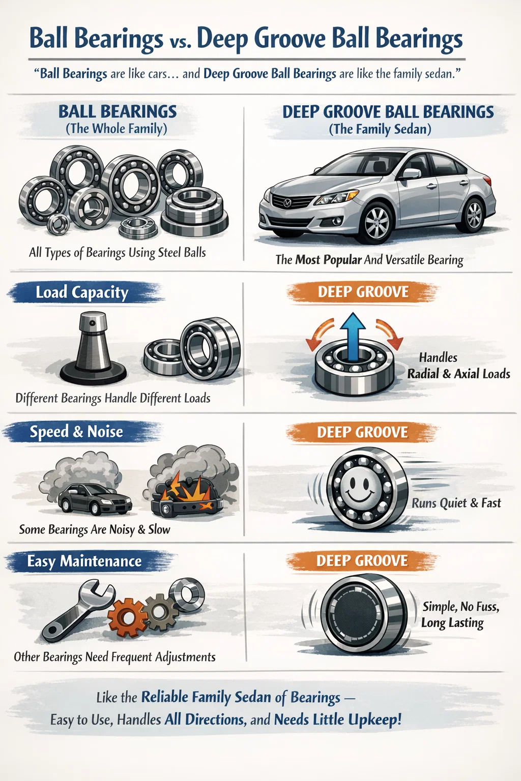 Du kan tenke på kulelager som "biler", og dype sporkulelager som den vanligste "familiesedan".
